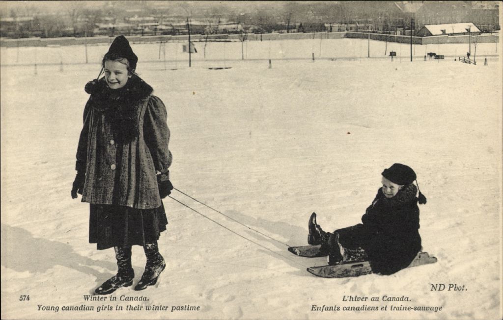 Winter in Canada, young canadian girls in their winter pastime L'hiver au Canada, enfants canadiens et traîne-sauvage