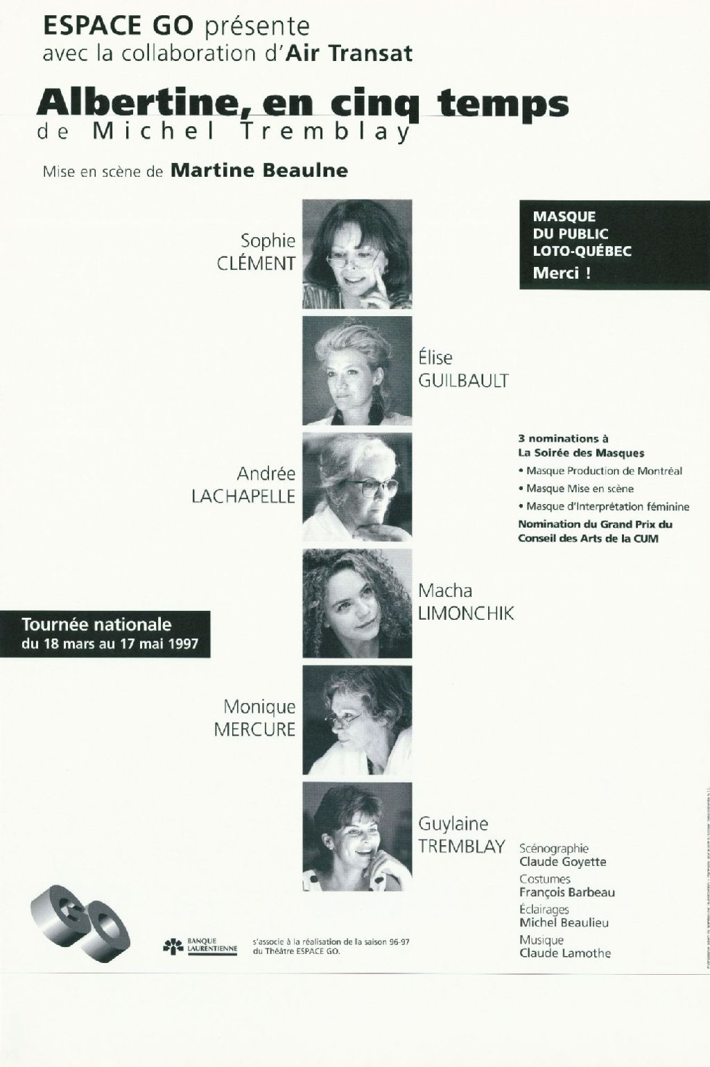 Espace Go présente avec la collaboration d'Air transat, Albertine, en cinq temps, de Michel Tremblay, mise en scène de Martine Beaulne tournée nationale