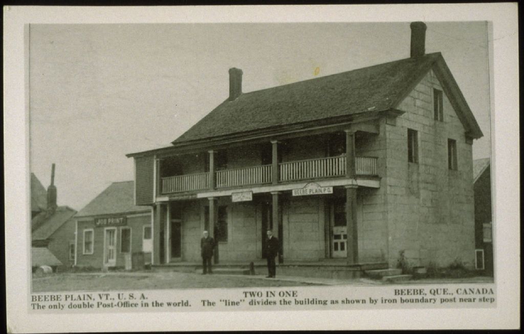 Beebe Plain, VT., U.S.A. Two in one Beebe, Que., Canada ; The only double Post-Office in the world. The "line" divides the building as shown by iron boundary post near step