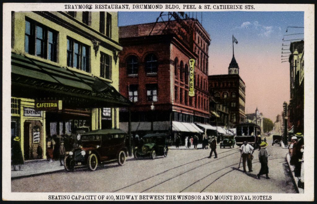 Traymore Restaurant, Drummond Bldg., Peel & St. Catherine Sts. seating capacity of 400, midway between the Windsor and Mount Royal hotels