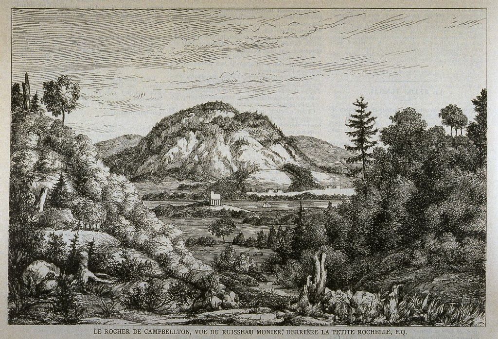 Le rocher de Capbellton, vue du ruisseau Monier, derrière la Petite Rochelle, P.Q.