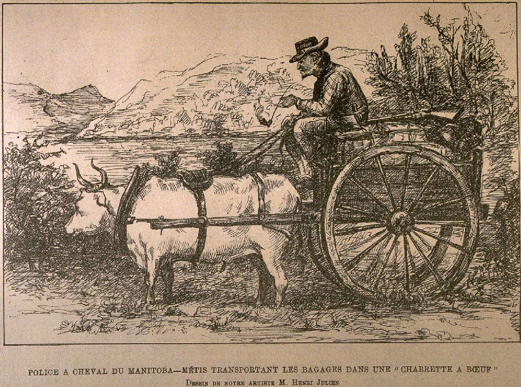 Police à cheval du Manitoba métis transportant les bagages dans une charette à boeuf /