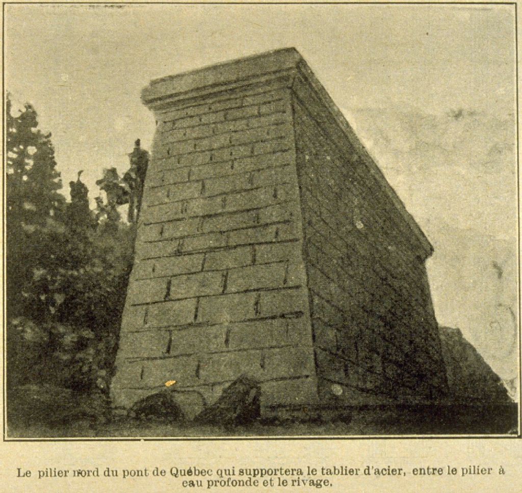 Le pilier Nord du pont de Québec qui supportera le tablier d'acier, entre le pilier à eau profonde et le rivage