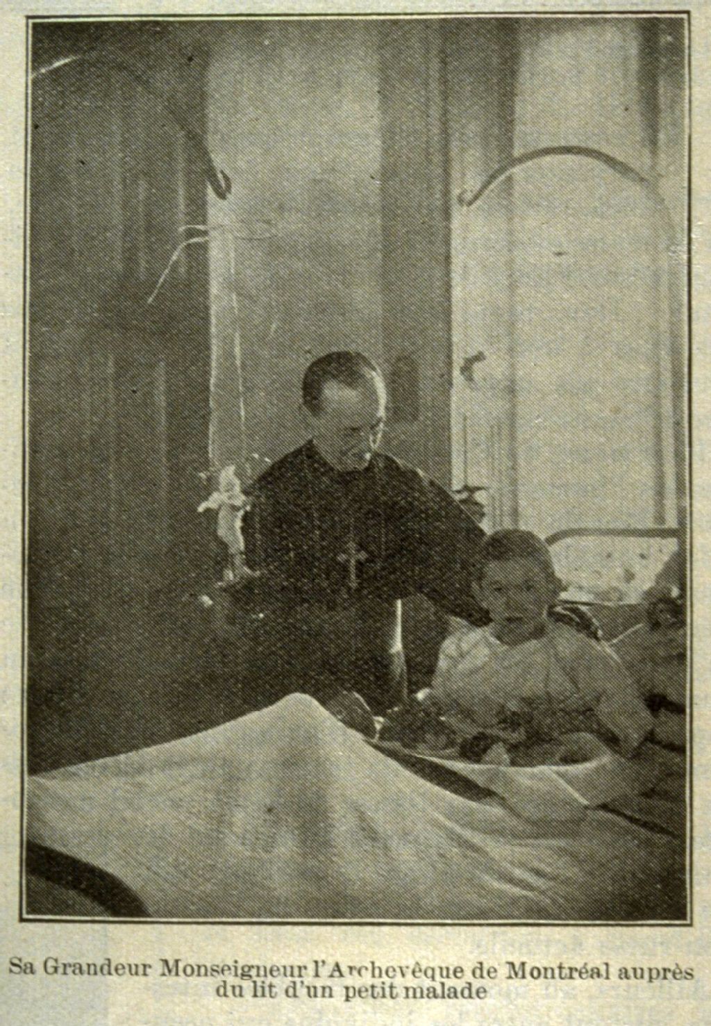 Le dîner de Noël des pauvres malades sa grandeur Monseigneur l'Archevêque de Montréal auprès du lit d'un petit malade