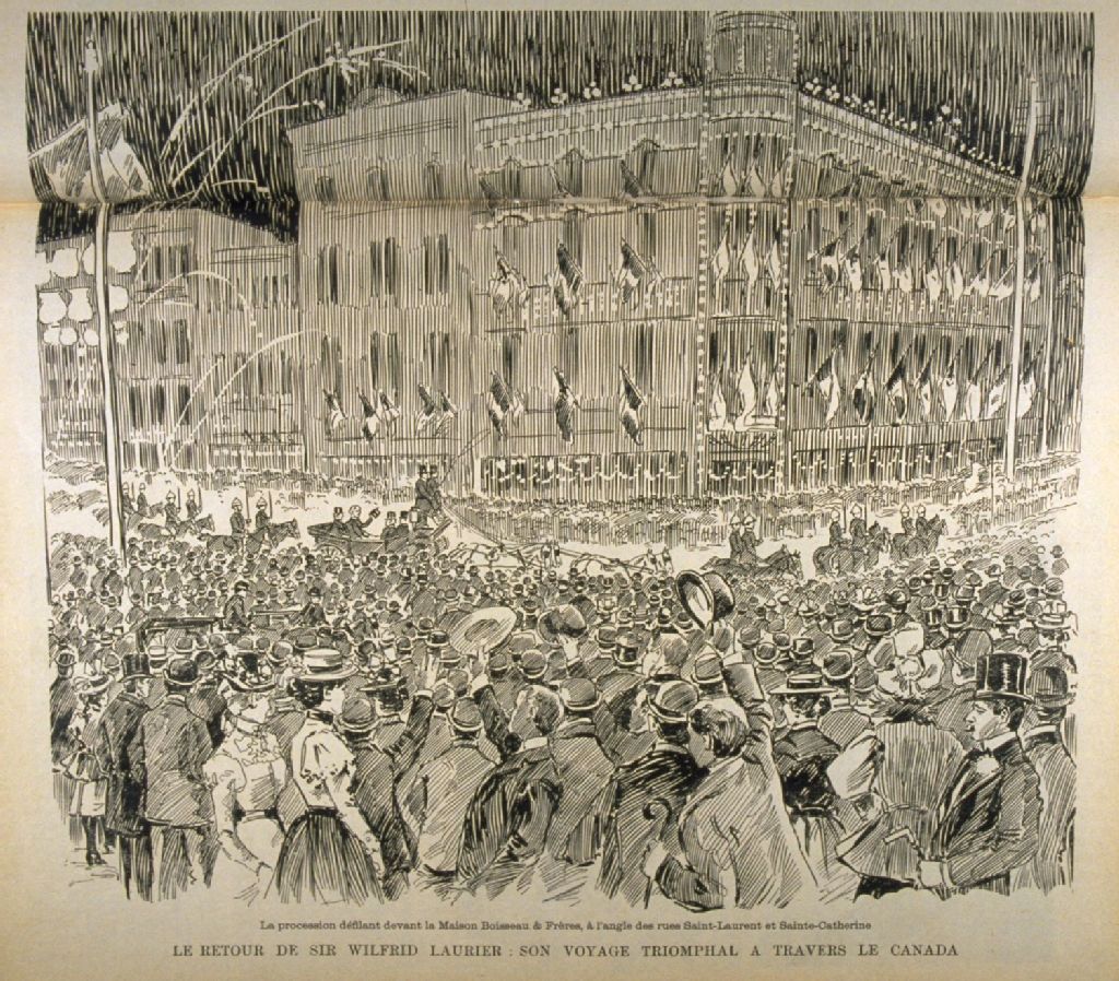 Le retour de Sir Wilfrid Laurier Son voyage triomphal à travers le Canada : La procession défilant devant la Maison Boisseau & Frères, à l'angle des rues Saint-Laurent et Sainte-Catherine