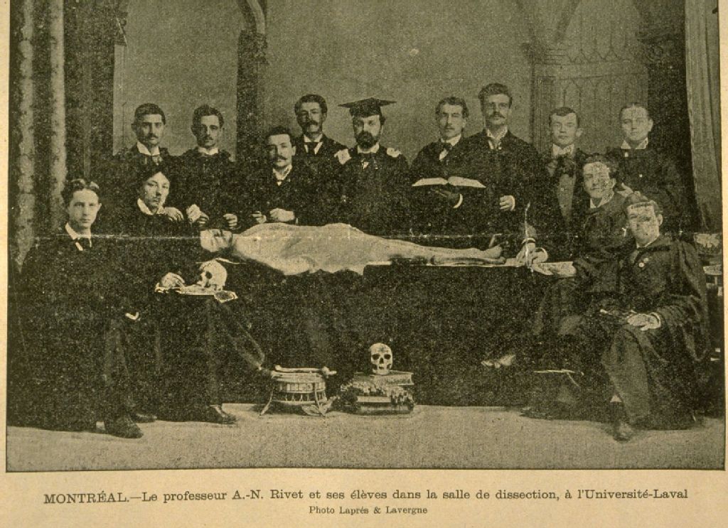 Le professeur A.-N. Rivet et ses élèves dans la salle de dissection, à l'Université-Laval