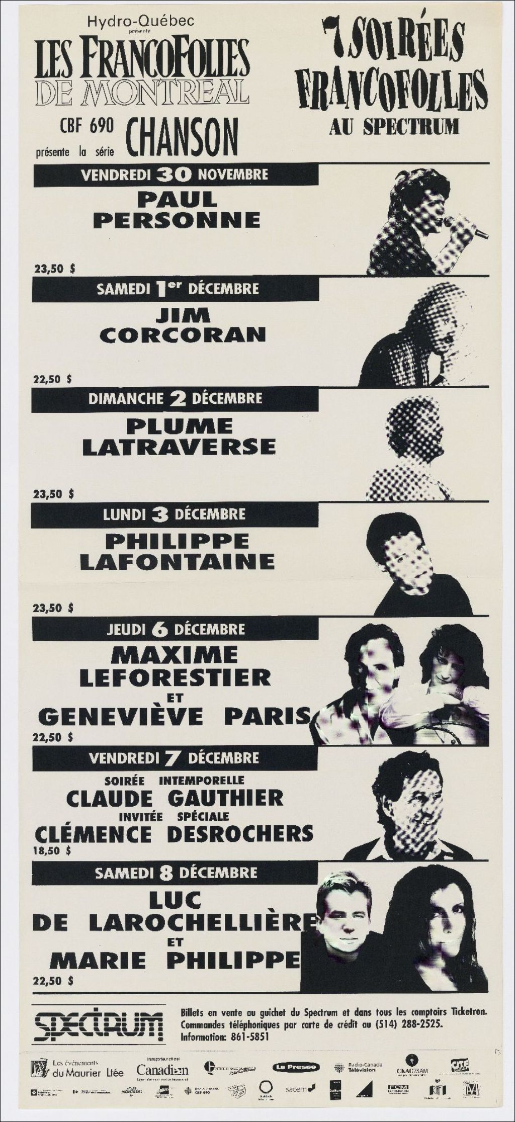 Hydro-Québec présente les Francofolies de Montréal ... série Chanson 7 soirées francofolles au Spectrum : Paul Personne ... Jim Corcoran ... Plume Latraverse ...