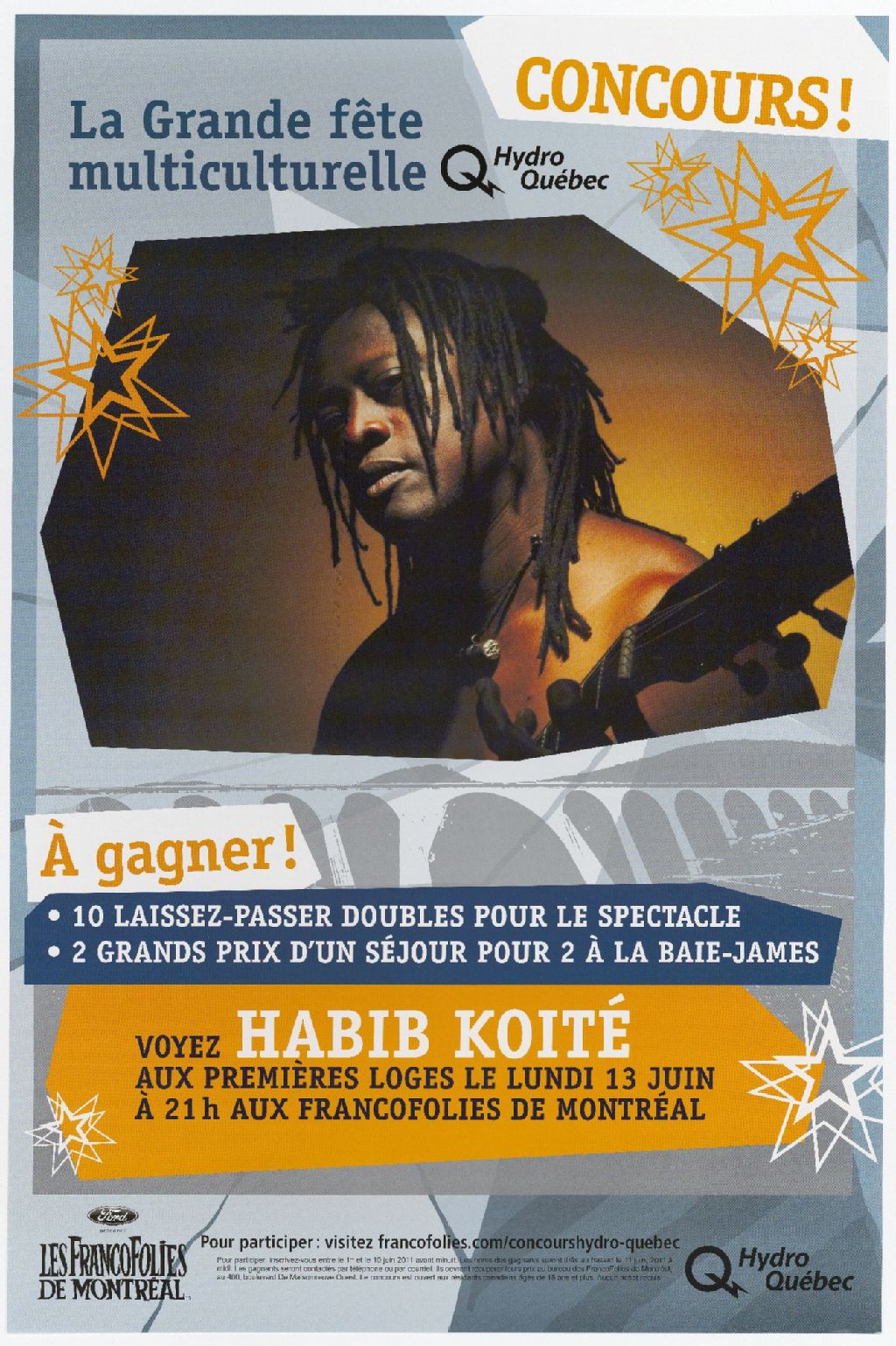 Concours!, La Grande Fête multiculturelle Hydro Québec à gagner!, 10 laissez-passer doubles pour le spectacle, 2 grands prix d'un séjour pour 2 à la Baie-James : voyez Habib Koité aux premières loges le lundi 13 juin à 21h aux FrancoFolies de Montréal