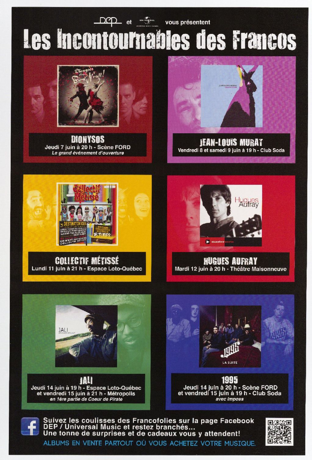 DEP et Universal Music Canada présentent les incontournables des Francos Dionysos ... Jean-Louis Murat ... Collectif métissé ... : albums en vente partout où vous achetez votre musique