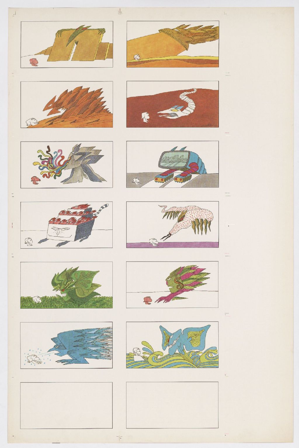 12 images sur 1 feuille : couleur ; images 11 x 21 cm, sur feuille 97 x 64 cm