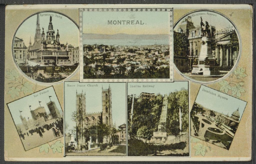 Montreal : Bonsecours Church; Maisoneuve Monument; Ice Palace; Notre Dame Church; incline railway; Dominion Square