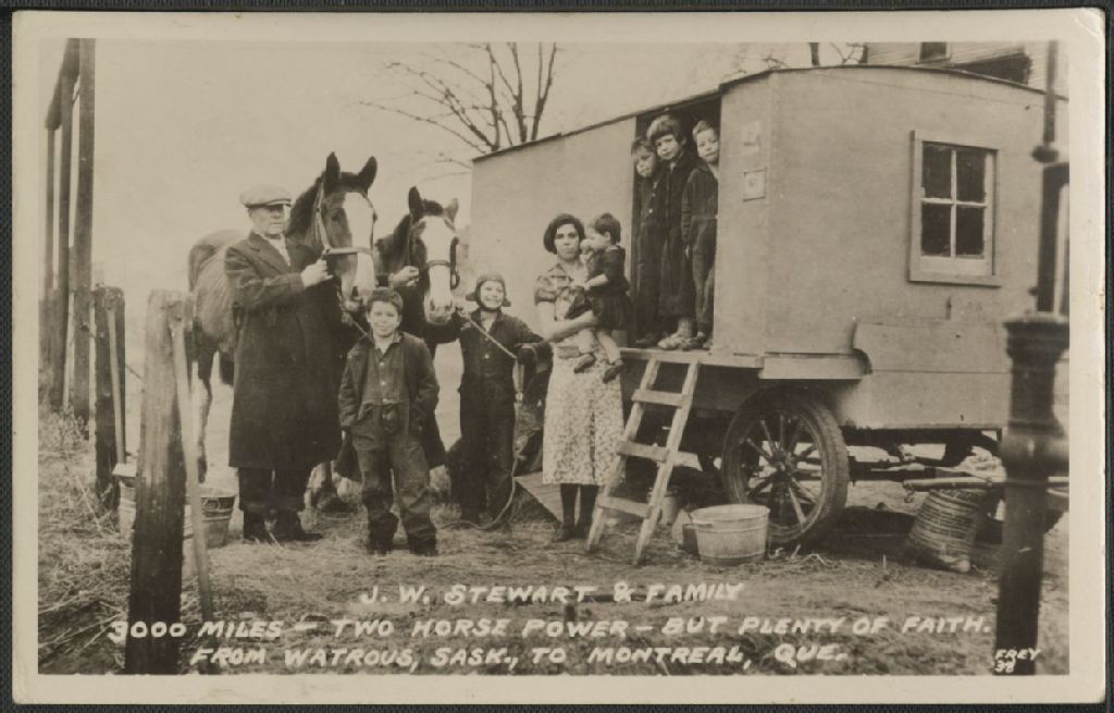 J.W. Stewart & family : 3000 miles, two horse power, but plenty of faith : from Watrous, Sask., to Montreal, Que./