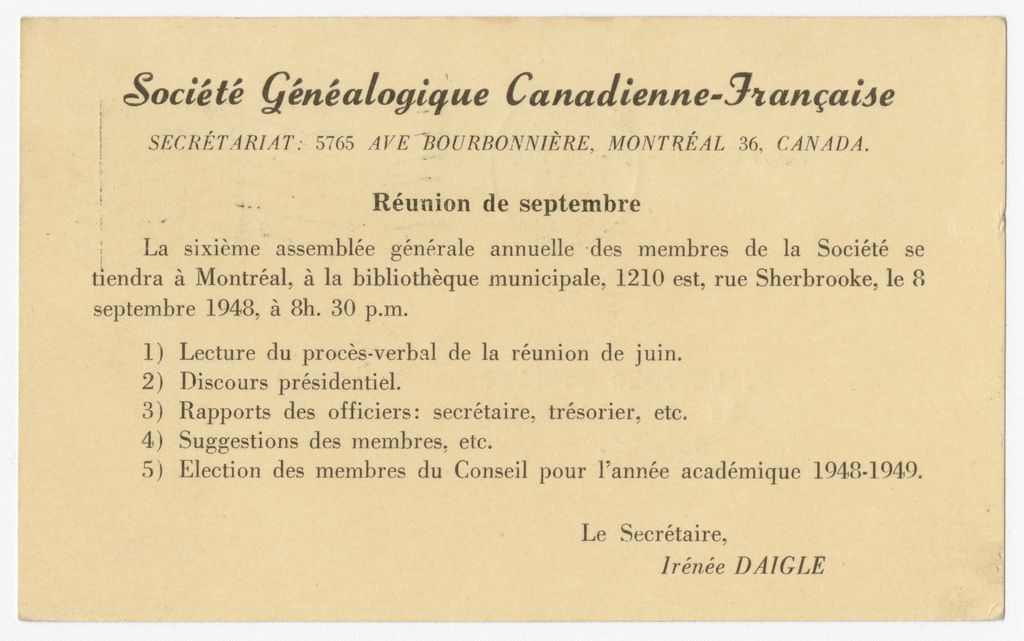 Société généalogique canadienne-française : réunion de septembre