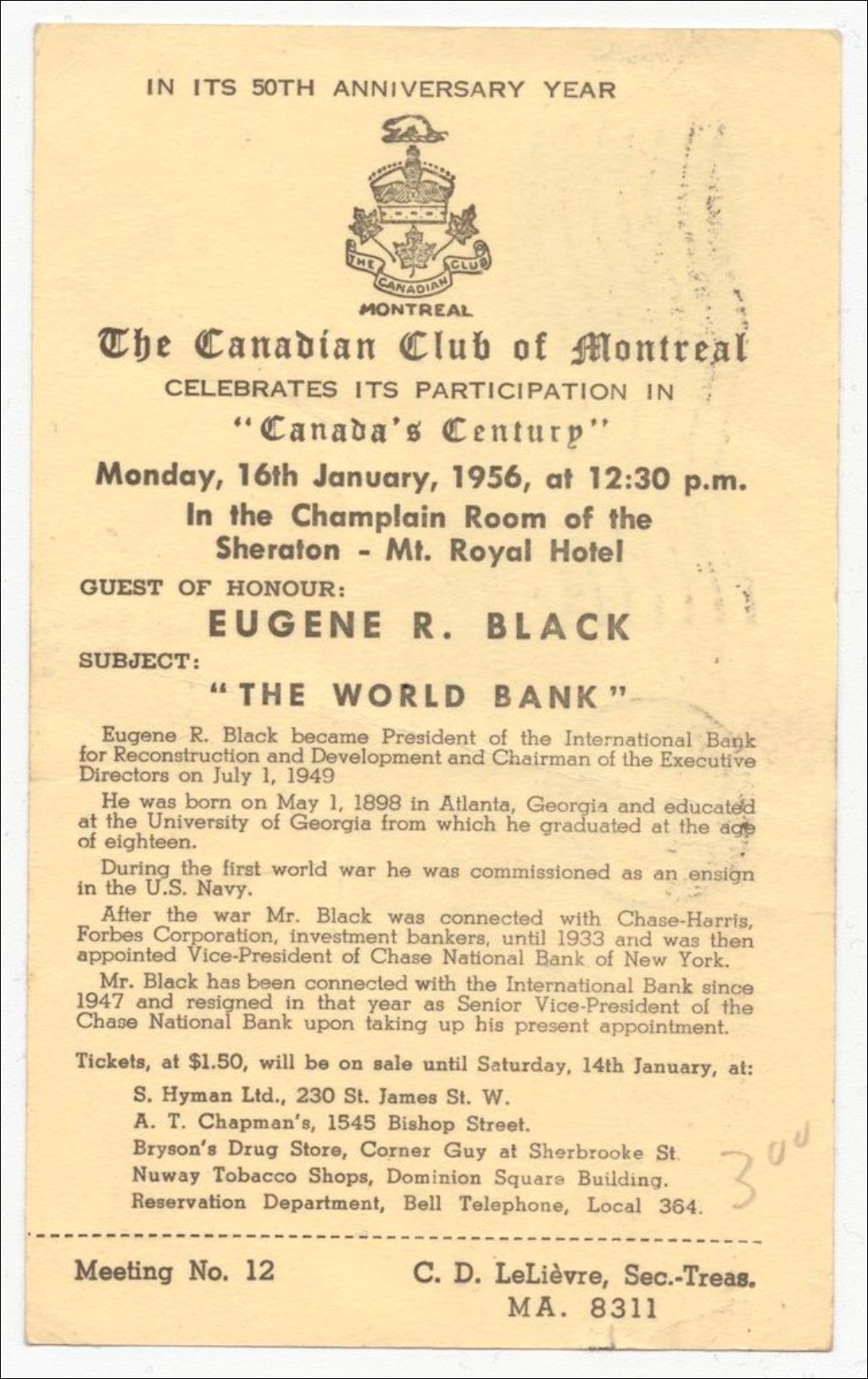 In its 50th anniversary year, the Canadian Club of Montreal celebrates its participation in "Canada's Centurp"