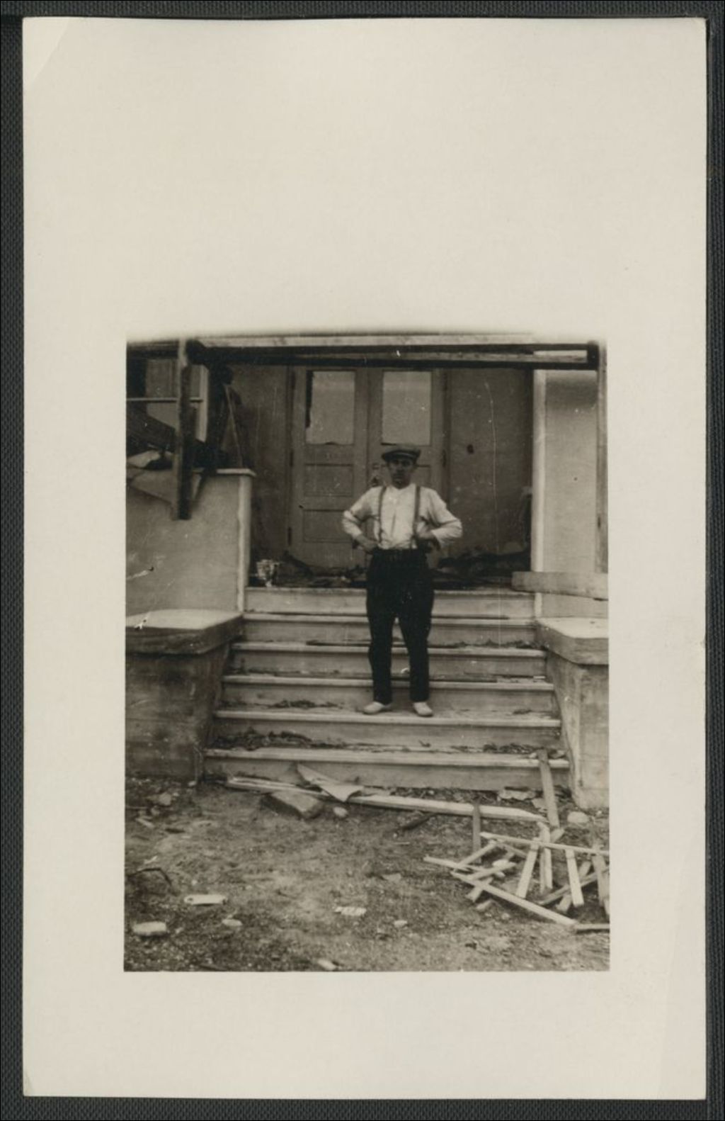 [Portrait d'un homme en chemise avec bretelles et casquette] /