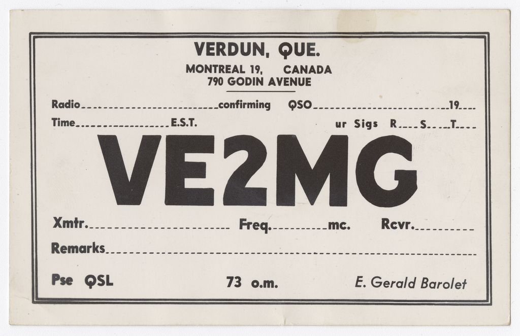 VE2MG : Verdun, Que., Montreal 19, Canada, 790 Godin Avenue