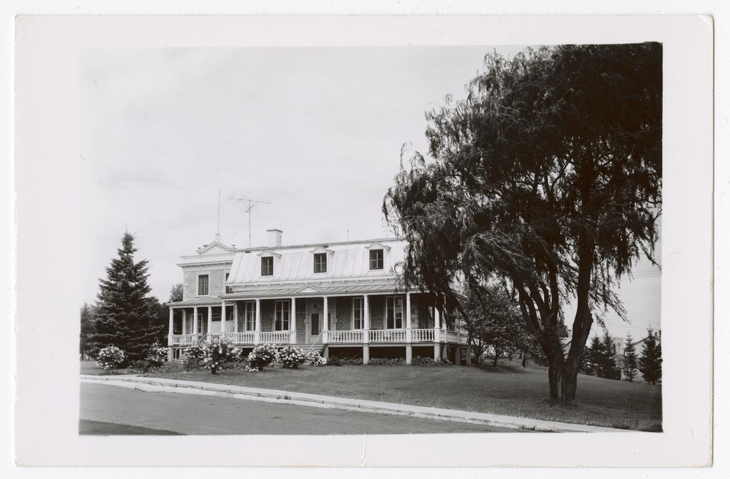 [Maison à toit mansardé, entourée d'une longue galerie à colonnes blanches]