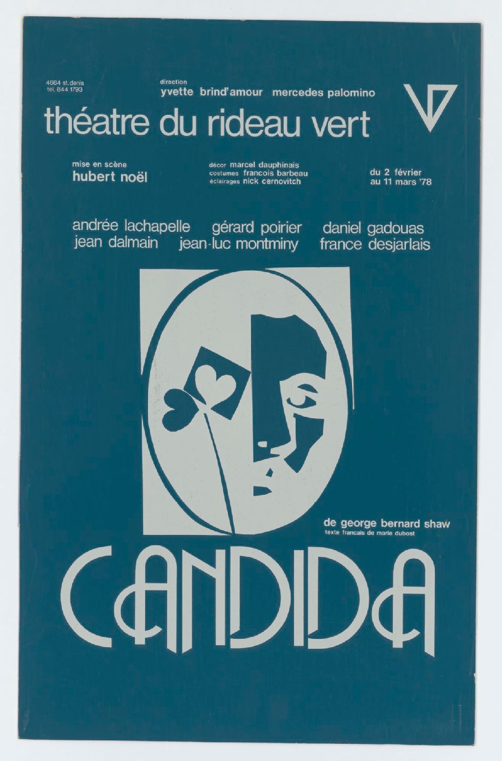 Candida, de George Bernard Shaw, texte français de Marie Dubost : mise en scène Hubert Noël ... du 2 février au 11 mars '78 : Andrée Lachapelle, Gérard Poirier, Daniel Gadouas, Jean Dalmain, Jean-Luc Montminy, France Desjarlais