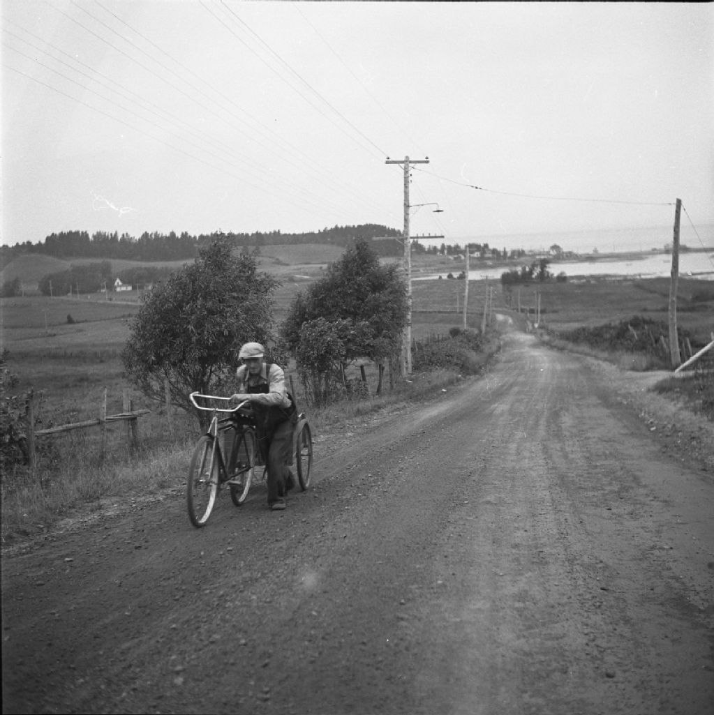 Vue d'un cycliste sur une route de [Trois-Pistoles], 1950, Archives nationales à Québec, Fonds Lida Moser, (03Q,P728,S1,D1,P16-10), Lida Moser.