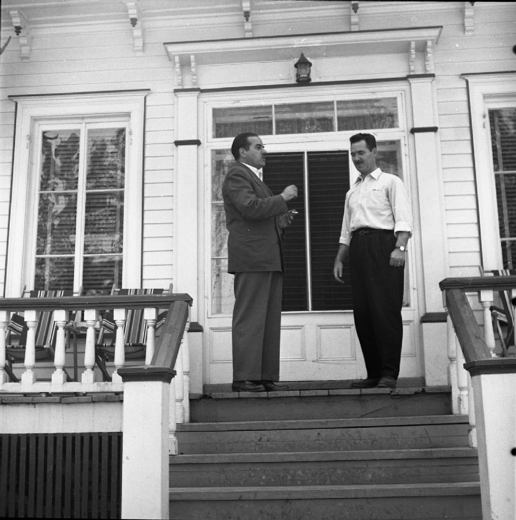 Paul Gouin avec un ami devant une résidence de Saint-André, 1950, Archives nationales à Québec, Fonds Lida Moser, (03Q,P728,S1,D1,P17-3), Lida Moser.