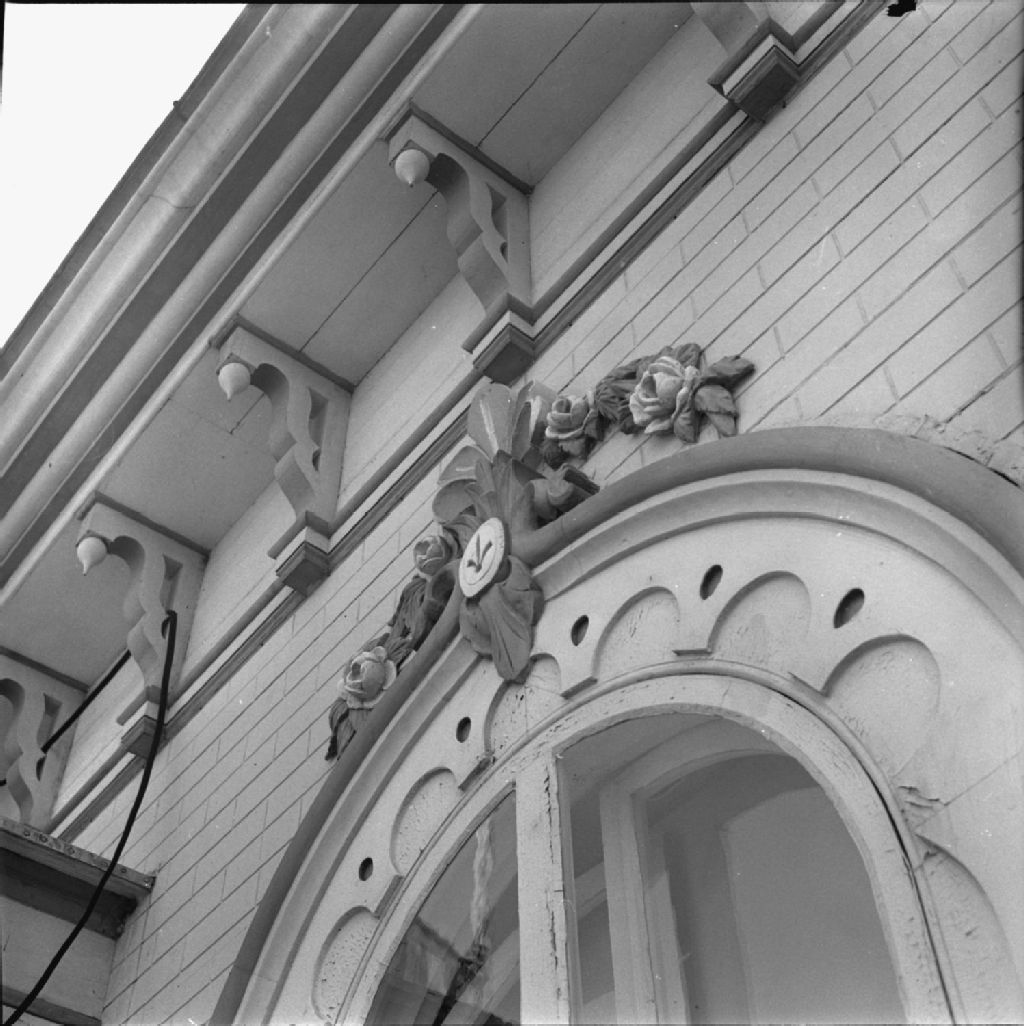 Détail d'une fenêtre de l'Hôtel Bellevue (Manoir Saint-André), Saint-André, 1950, Archives nationales à Québec, Fonds Lida Moser, (03Q,P728,S1,D1,P17-77), Lida Moser.