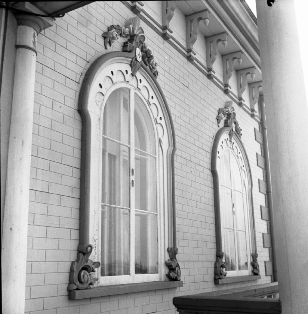 Détail des fenêtres de l'Hôtel Bellevue (Manoir Saint-André), Saint-André, 1950, Archives nationales à Québec, Fonds Lida Moser, (03Q,P728,S1,D1,P17-79), Lida Moser.