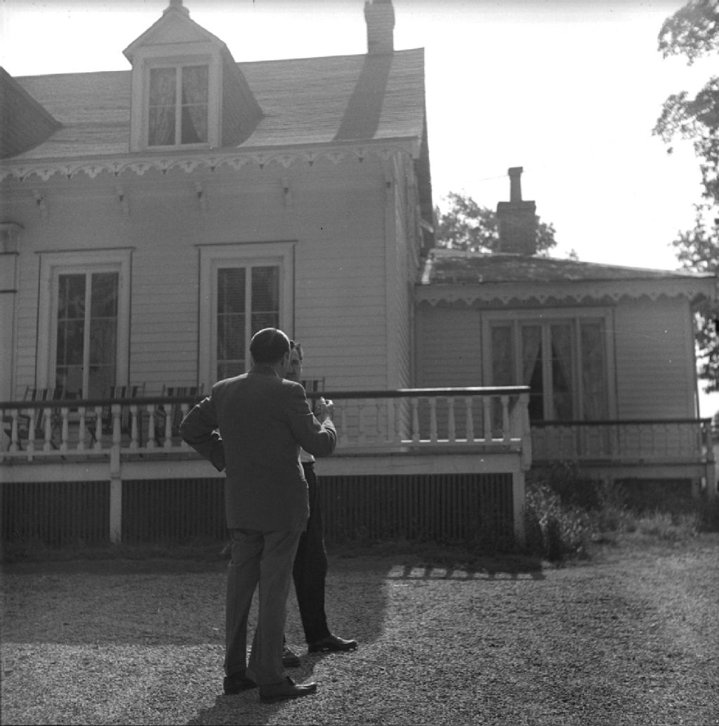 Paul Gouin avec un ami devant une résidence de Saint-André, 1950, Archives nationales à Québec, Fonds Lida Moser, (03Q,P728,S1,D1,P17-8), Lida Moser.