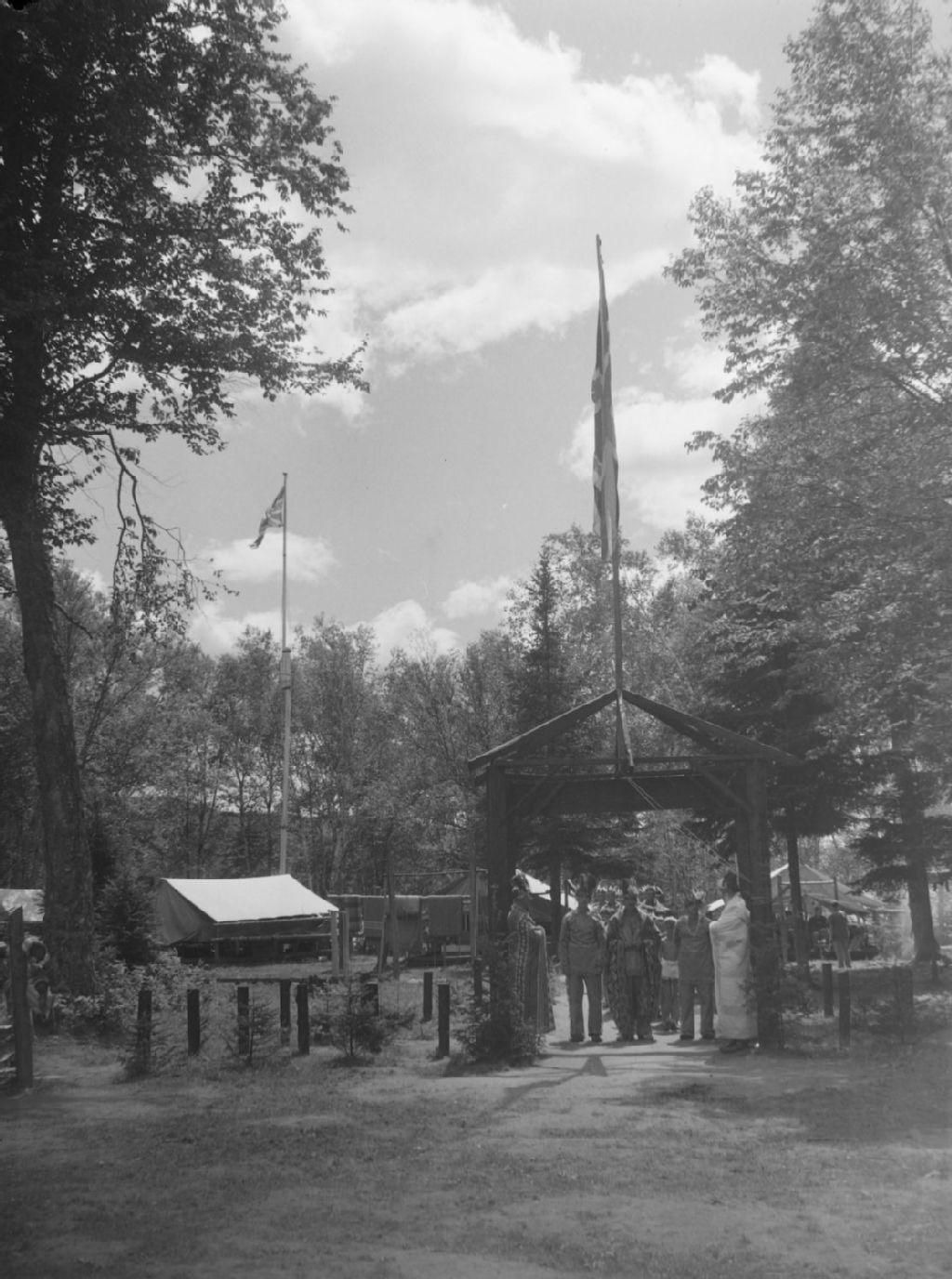 Des campeurs de la colonie de vacances «Powter's Camp» représentent les membres d'un conseil amérindien. Ils sont debout sous l'arche d'entrée du camp, coiffés de plumes et enroulés dans des couvertures à motifs