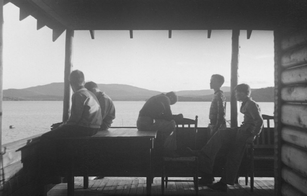 Cinq campeurs de la colonie de vacances «Powter's Camp» sont assis sur la terrasse d'un chalet donnant sur un lac