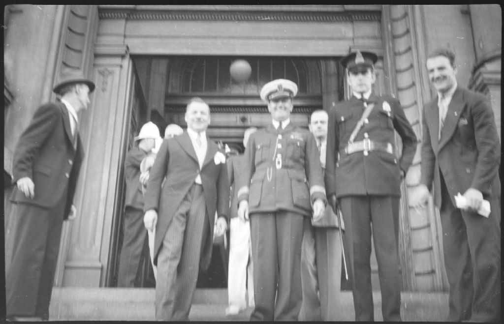 Lors d'une réception à l'hôtel de ville, nous voyons quelques militaires et des civils en habit d'apparat devant l'entrée principale d'un Hôtel de ville