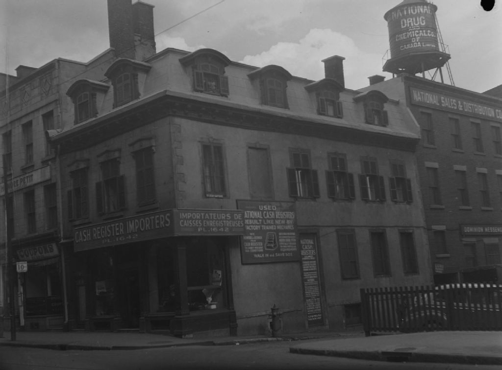 Nous voyons le commerce Importateurs de caisses enregistreuses situé à l'intersection des rues Notre-Dame Est et Saint-Jean-Baptiste à Montréal. Nous remarquons, au-dessus d'un édifice, la tour de «National Drug Chemical Co. of Canada Limited»