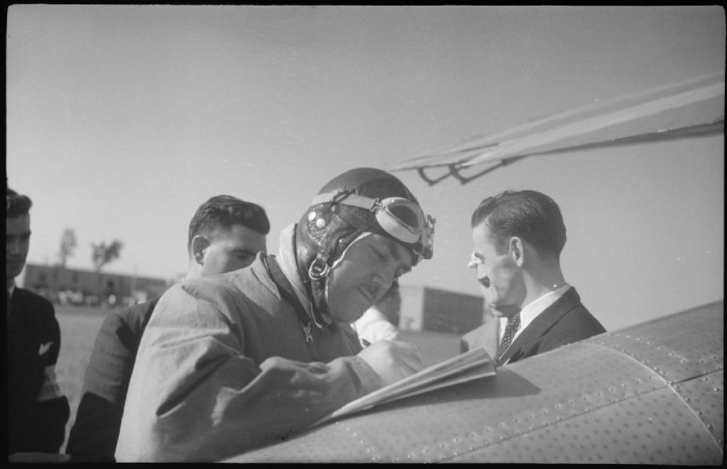 Nous apercevons un homme identifié comme étant le pilote Dovet. Nous observons que ce dernier signe un document, appuyé sur l'aile d'un avion, entouré de quelques spectateurs