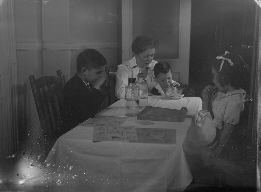 Trois patients de l'hôpital Sainte-Justine à Montréal prennent un liquide en aspirant dans un tube. Une dame tient le plus jeune sur ses genoux. Nous remarquons des cartes de jeux éducatifs sur la table