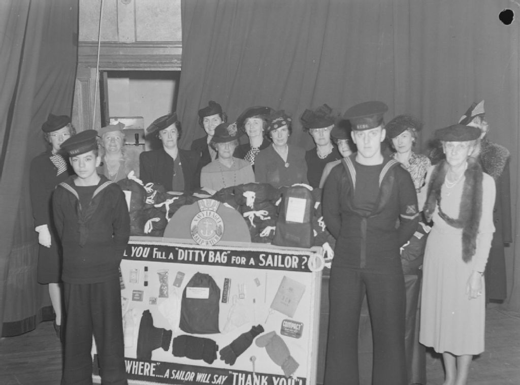 Le club des femmes catholiques de Westmount présente le panneau publicitaire et le résultat d'une collecte d'articles à mettre dans la trousse de voyage du marin. Deux cadets des «Royal Canadian Sea Cadets» (R.C.S.C.) se tiennent de chaque côté du panneau