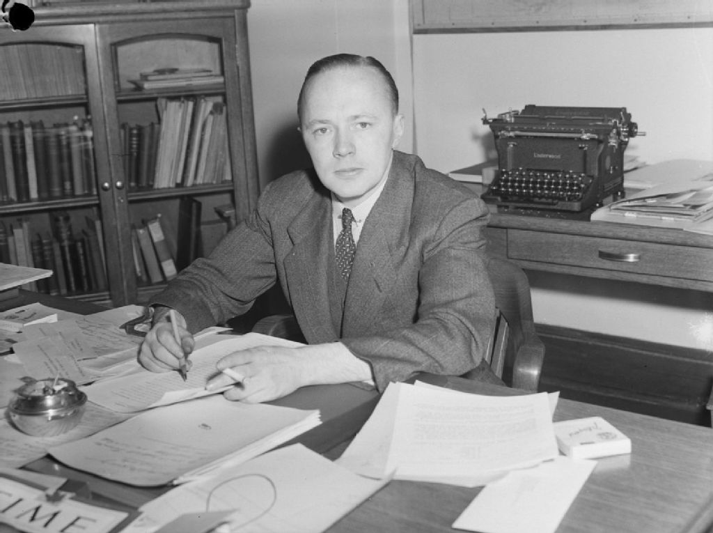 Nous voyons Monsieur Segee, employé de la Société Radio-Canada (CBC), dans son bureau de la rue Sainte-Catherine Ouest à Montréal. Nous remarquons une machine à écrire Underwood à l'arrière-plan