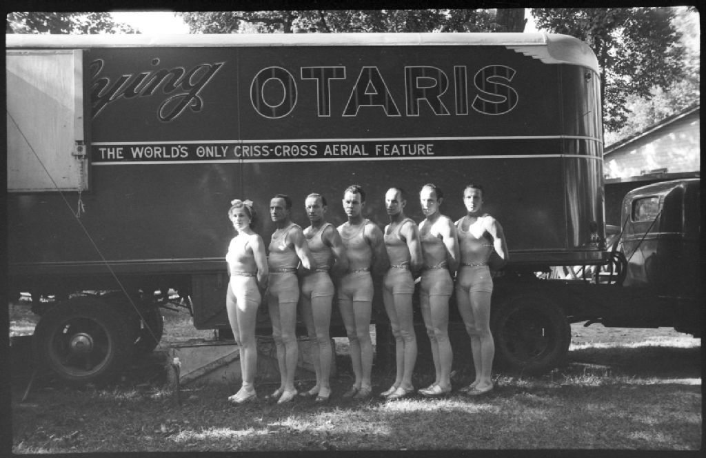 Nous voyons un troupe de trapézistes "The Flying Otaris" posant devant leur affiche publicitaire au parc Belmont à Cartierville