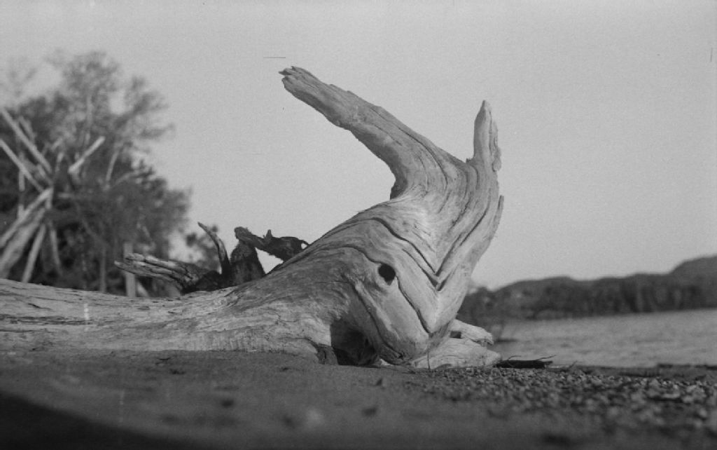 Nous voyons un bout d'arbre mort rejeté sur le rivage du lac situé sur le site de la colonie de vacances «Powter's Camp»