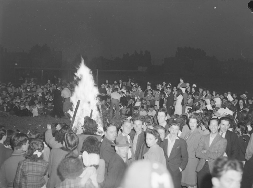 Plusieurs personnes forment un cercle autour d'un feu de joie. Ils sont au terrain de jeux de l'avenue Henri-Julien à Montréal
