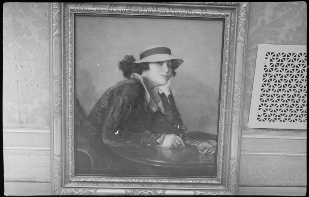 Nous voyons la reproduction d'une oeuvre peinte intituée "Harmony in Brown and Gray". L'oeuvre est signée Adam Sheriff Scott et est exposée à la galerie de l'« Art Association » de Montréal, située au 1379 Sherbrooke Ouest. Nous apercevons une femme coiffée d'un chapeau, accoudée à une table et tenant un verre à vin à la main