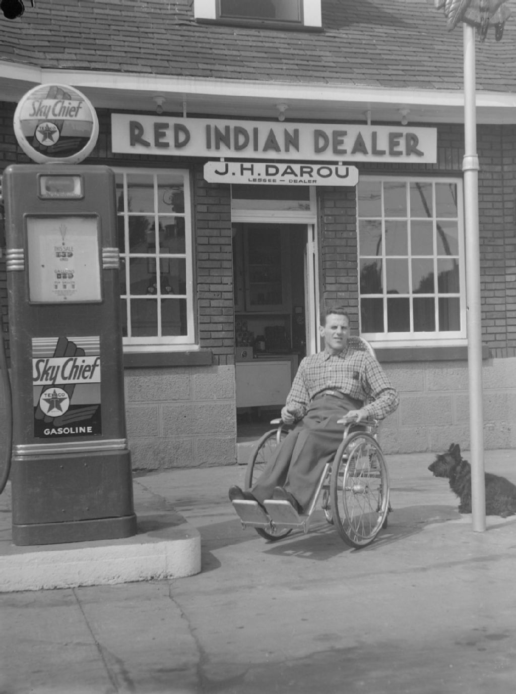 Paraplégique, Jimmy Darou est confiné à un fauteuil roulant. Nous le voyons devant la station-service Cheerio située au 1, avenue Westminster Nord à Montréal-Ouest dont il est le propriétaire. Monsieur Darou est détaillant de l'essence «Red Indian Chief Gasoline»
