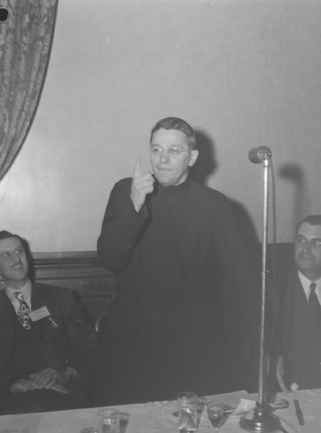 Le père F. Emil Bouvier, s.f., parle au microphone lors de la conférence annuelle de l'Association des boulangers et pâtissiers du Québec présentée à Montréal