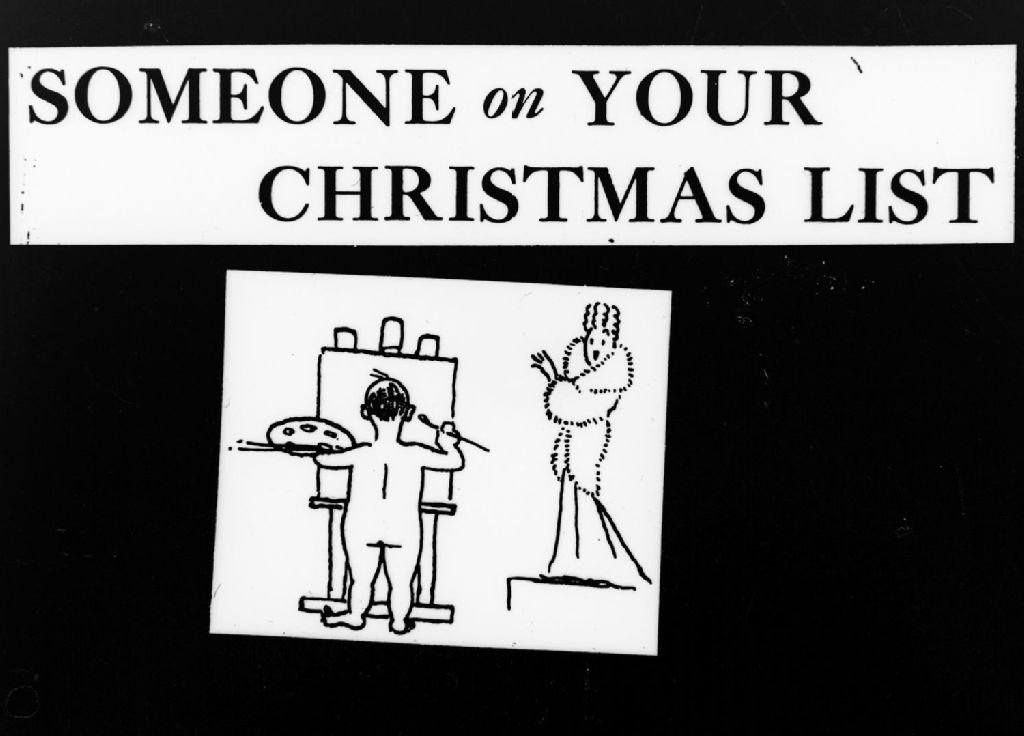 Nous voyons le dessin d'un peintre nu devant son chevalet tenant sa palette et peignant son modèle vêtu d'un manteau de fourrure. Les mots «Someone on Your Christmas List» identifient cette illustration