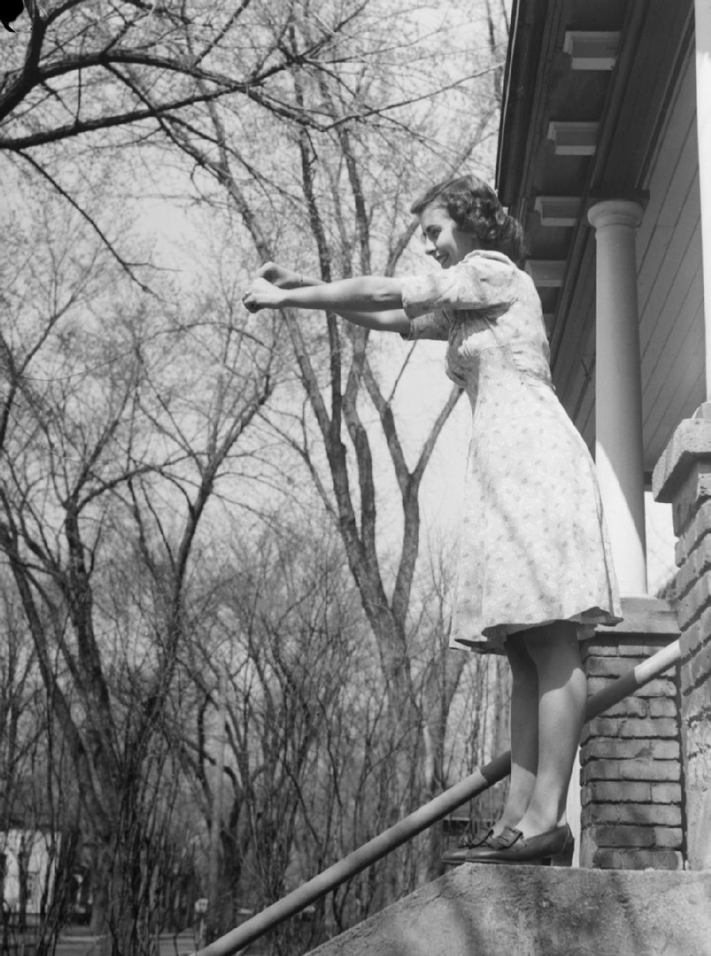 Eileen Greenwood mime le geste d'étendre un vêtement à sécher sur la corde à linge