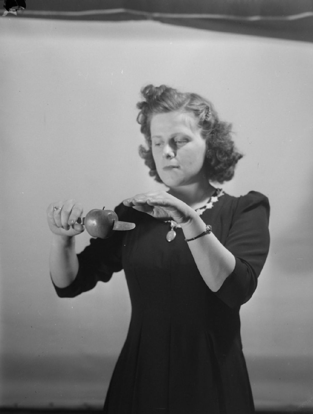 Fernande Lambert fait la démonstration de la force d'inertie en frappant avec la main sur un couteau qui transperce une pomme