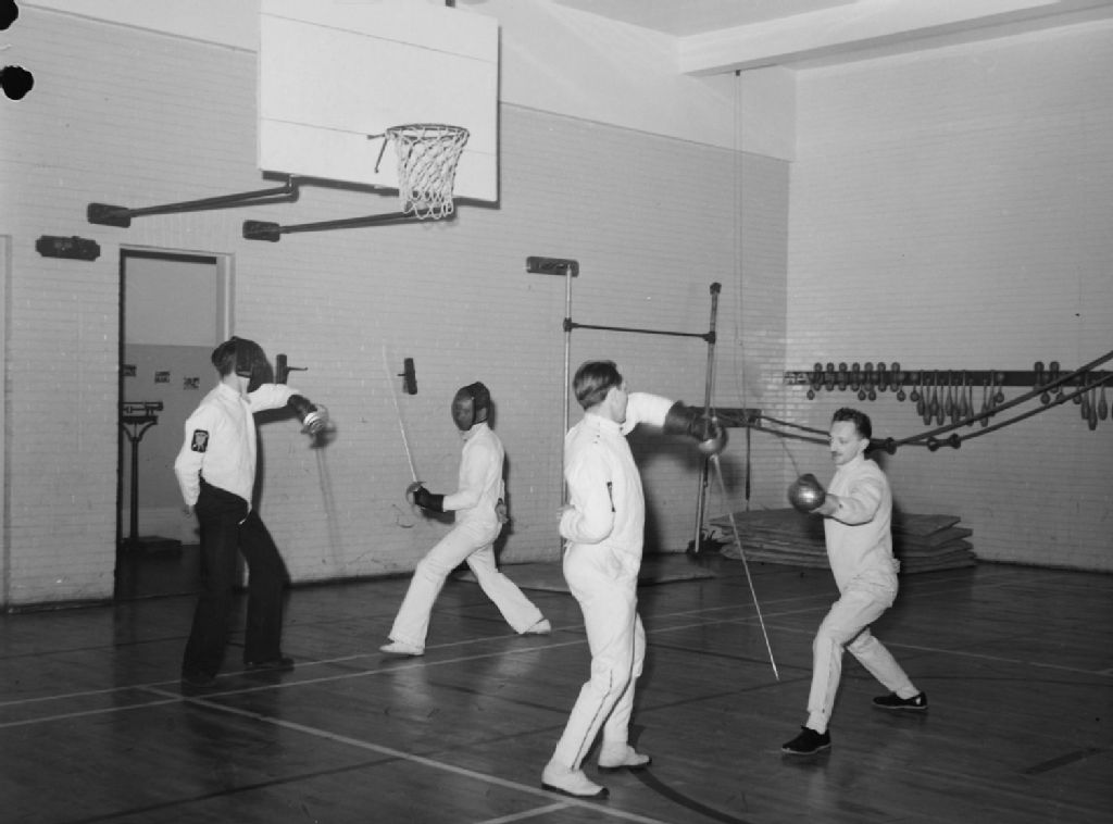 Fencing. Palestre Nationale, 9 avril 1945, Archives nationales à Montréal, Fonds Conrad Poirier, (06M,P48,S1,P11948), Poirier, Conrad.