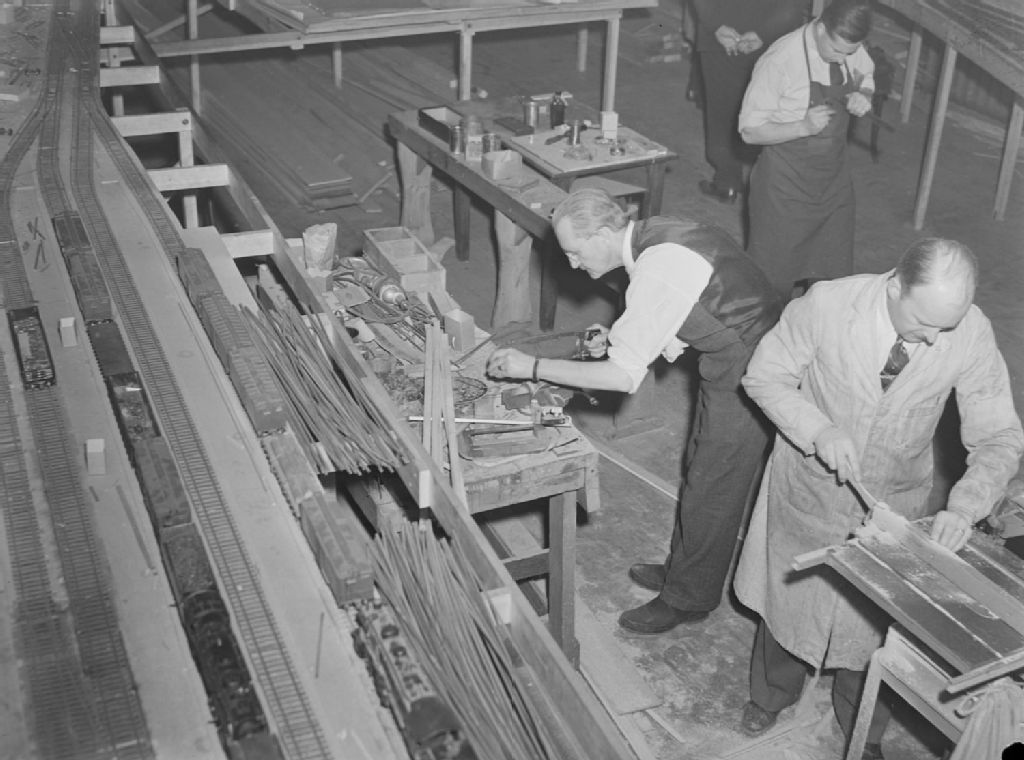 Nous voyons des membres du Club de modèles réduits de trains de Montréal dans l'atelier d'assemblage et de fabrication. Un homme travaille avec une scie à métaux, un autre avec un marteau et un troisième à un plateau de sciage
