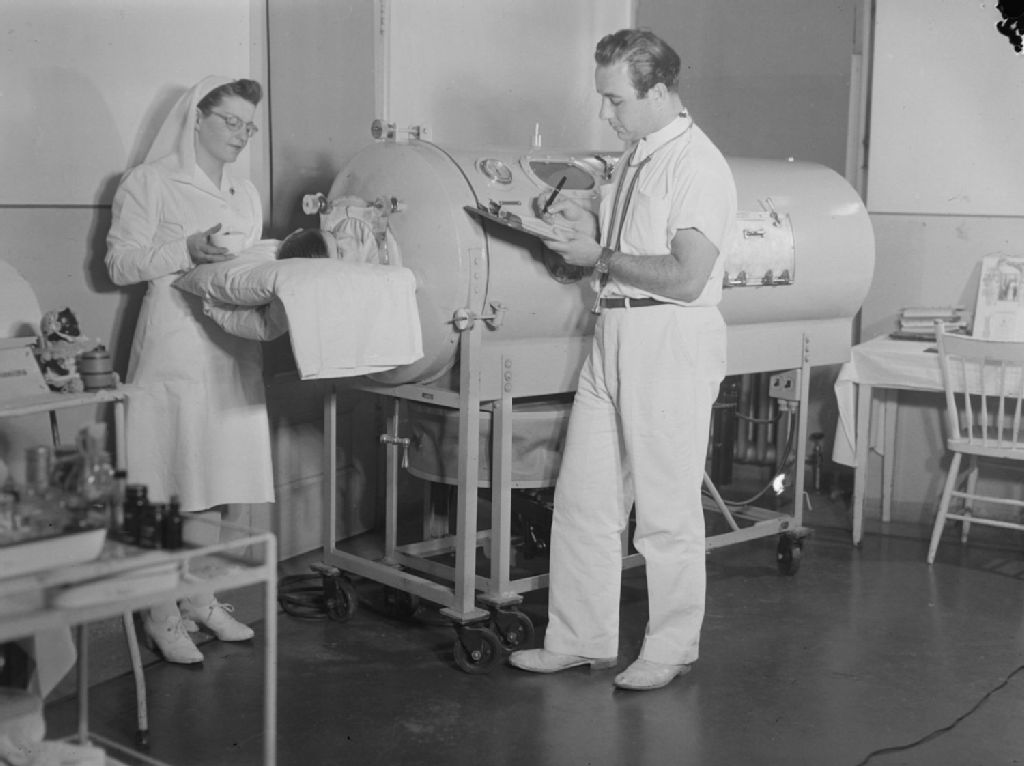 Nous voyons la tête d'un enfant à l'extrémité d'un poumon d'acier à l'hôpital Sainte-Justine à Montréal. Un médecin et une infirmière s'occupent du patient et relèvent des données