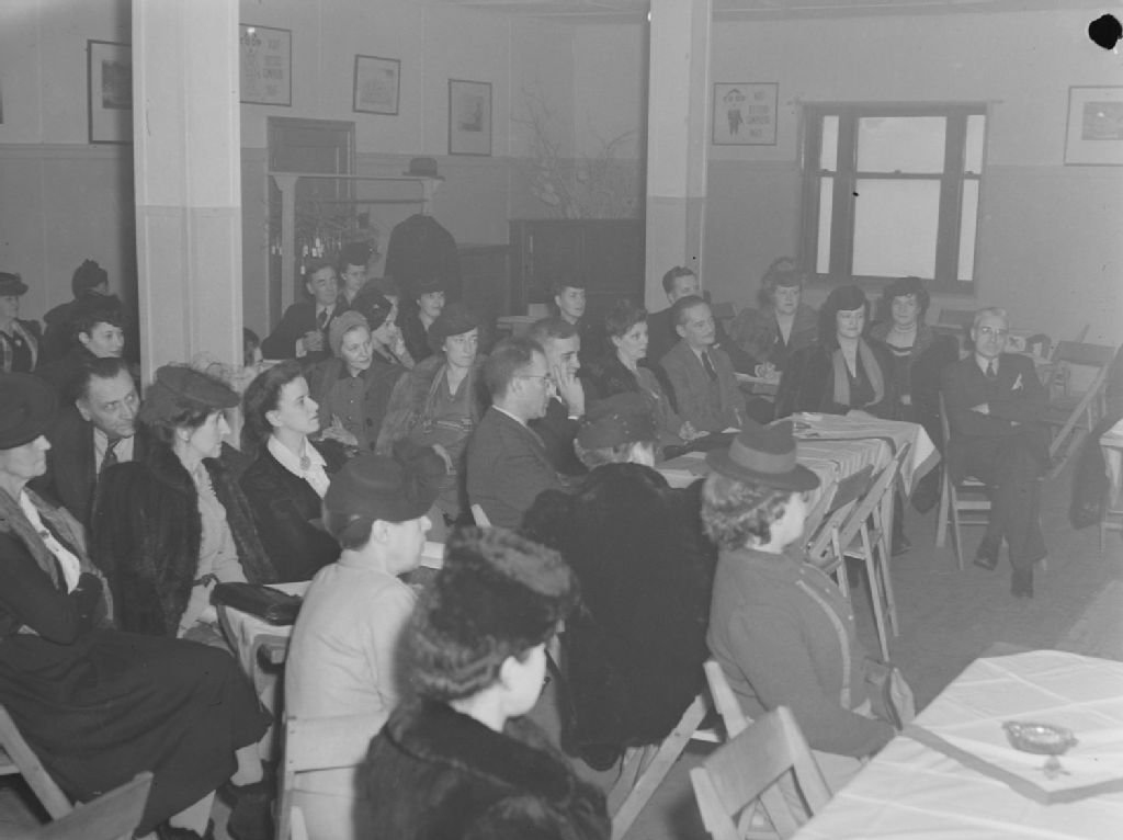 Nous voyons des personnes qui participent à une réunion dans un local de la Coopérative de consommation La Familiale située sur la rue Saint-Hubert à Montréal
