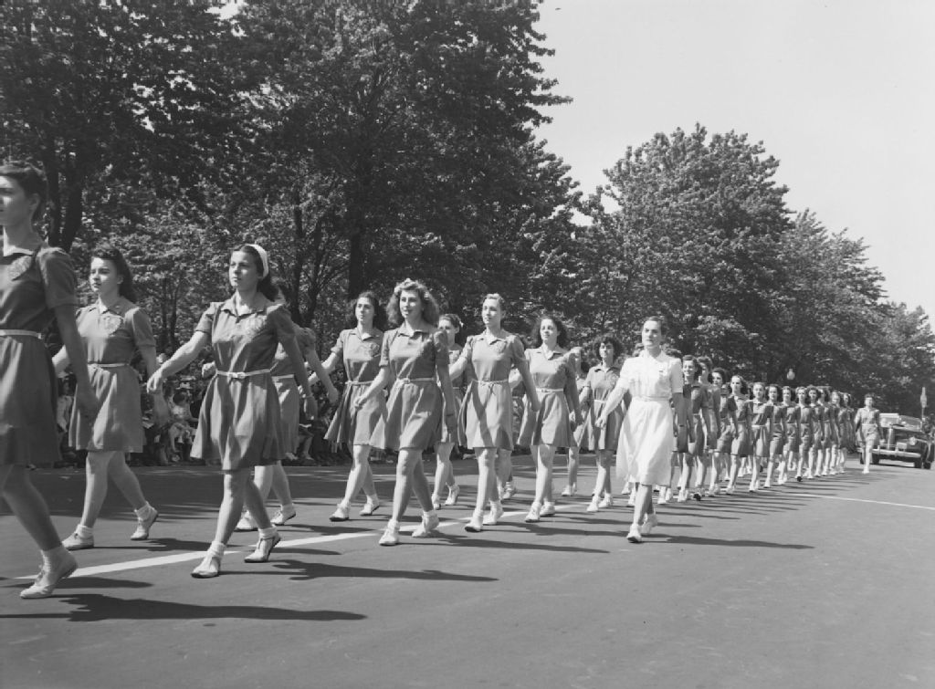 Nous voyons des jeunes filles marchant deux par deux lors du défilé de la Saint-Jean-Baptiste à Montréal
