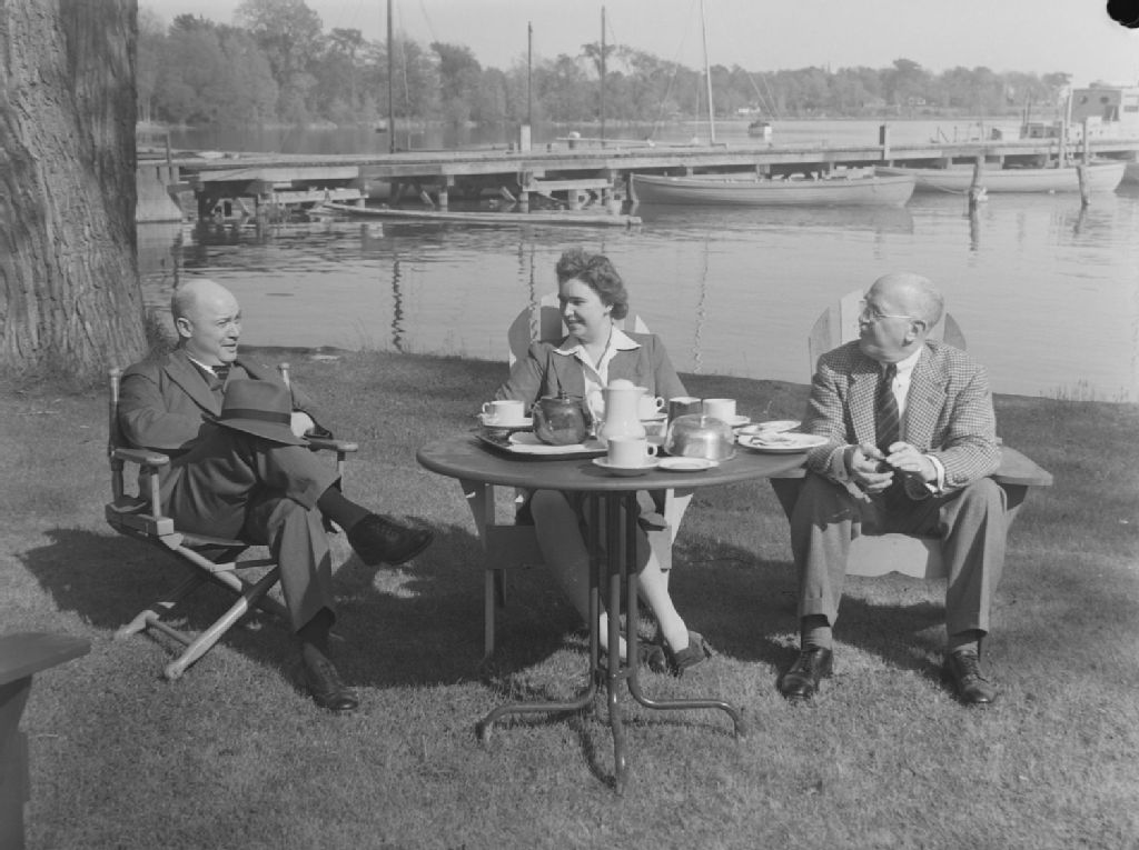 Trois personnes prennent dessert et thé autour d'une table sur la pelouse du Royal Saint Lawrence Yacht Club à Dorval. À l'arrière-plan nous voyons un ponton et des bateaux
